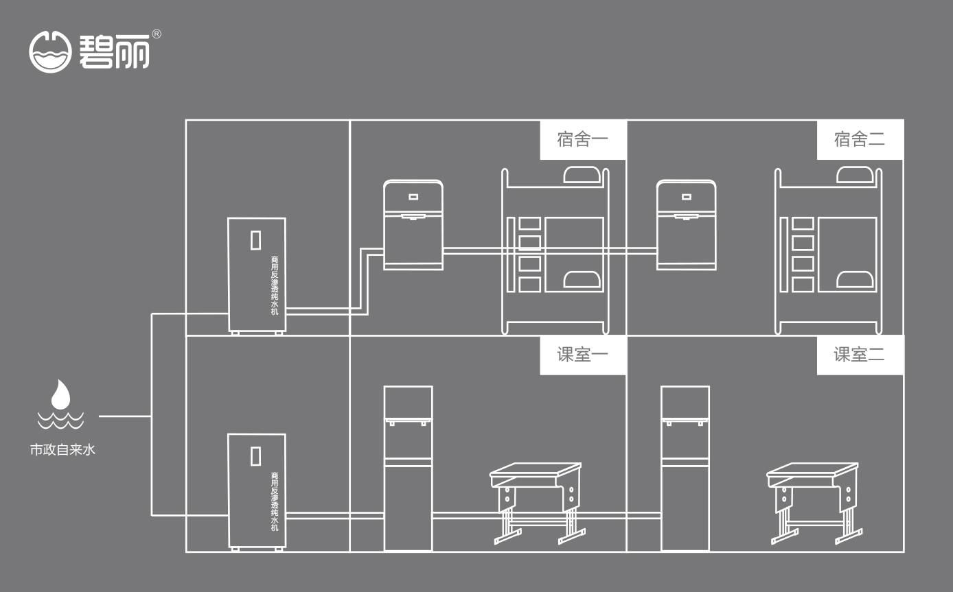 碧丽商用反渗透纯水机将自来水集中处理后,把优质的纯净水通过专用的供水管道输送到各饮水点;