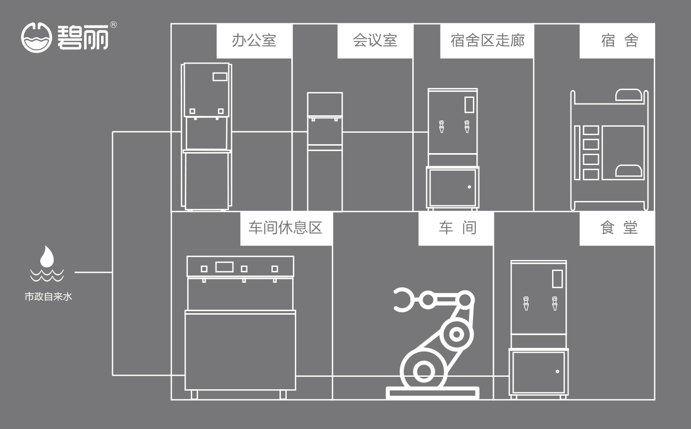 碧丽商用反渗透纯水机将自来水集中处理后,把优质的纯净水通过专用的供水管道输送到各饮水点;
